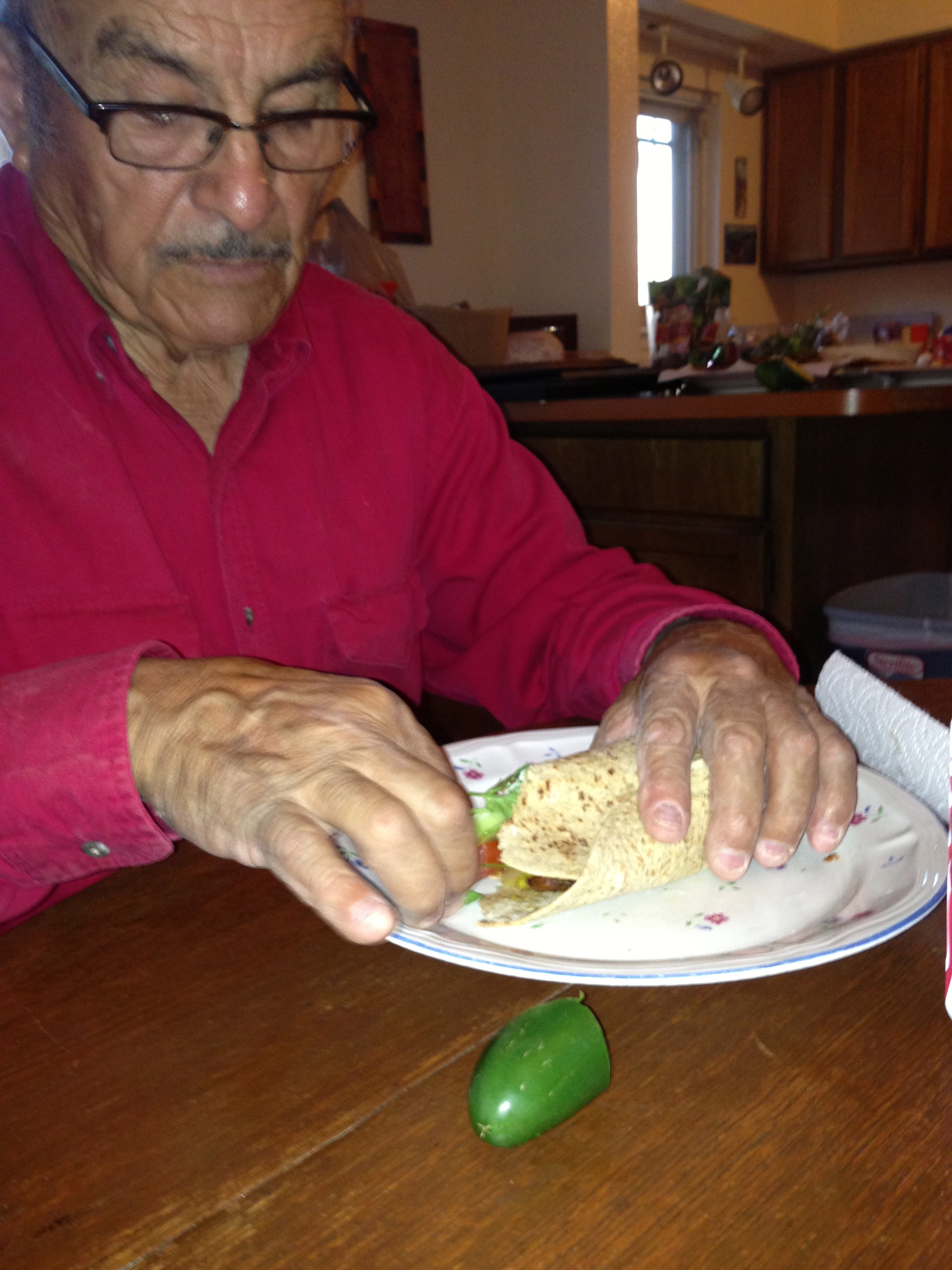 Yes. My dad actually put a slice of pizza inside a tortilla and ate it as the filling. Here on the left, for example, is one of my favorites. I love to cook and usually treat my parents to some new foreign cuisines. On this particular evening, I decided to make falafel for the first time. My dad decided to eat the falafel with a flour tortilla…and a jalapeño. Close enough to a wrap, I suppose.