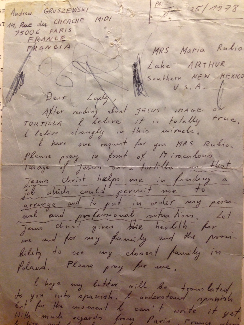 Mr. Gruszewski, who was living in Paris, France in 1978, just one year after the discovery of the Jesus tortilla, wrote a letter to my mom, letting her know that he, “totally believed strongly in this miracle.” He does not make mention as to how he found out about my mom and the Jesus tortilla, unfortunately.  However, he does go on to say the following: